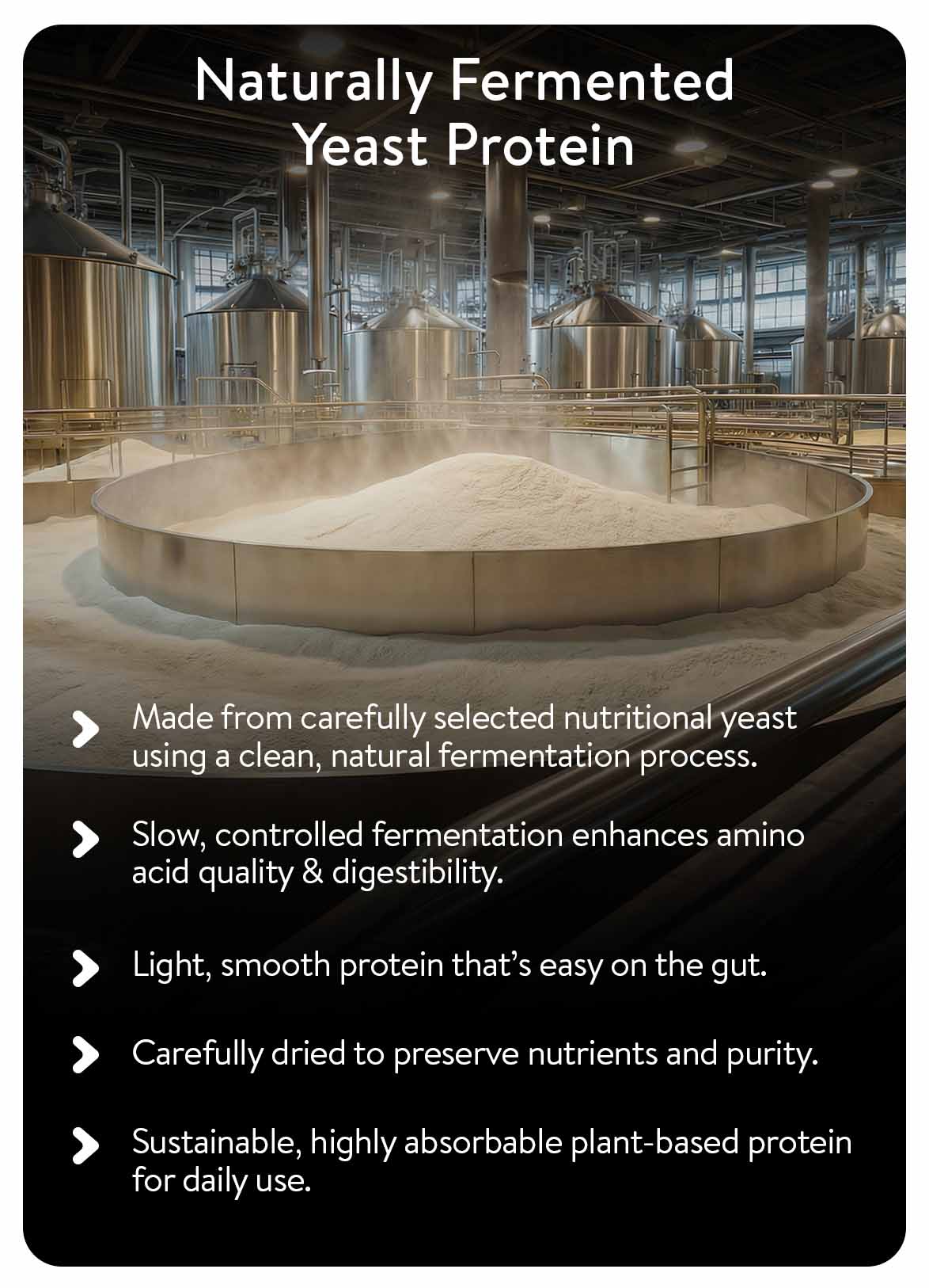 Fermented Yeast Protein is naturally free from common allergens like lactose, gluten, dairy and soy.