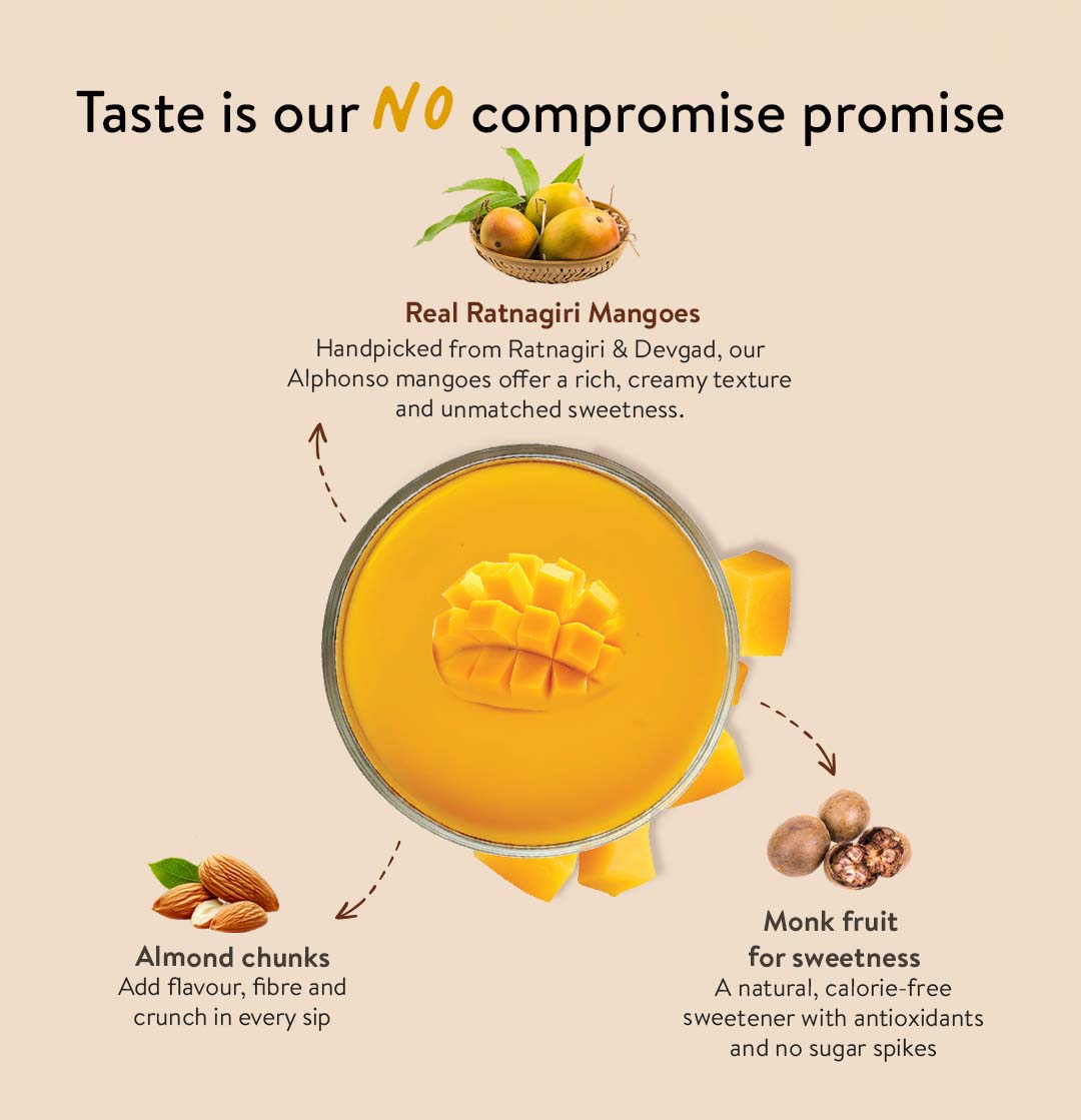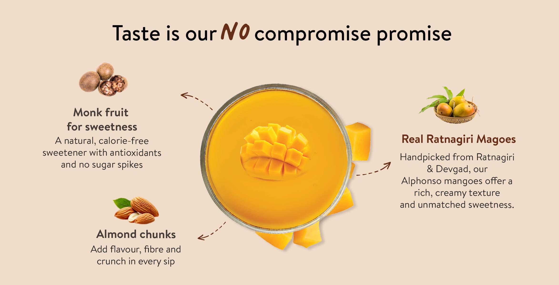 We source real ingredients — like Ghana cocoa, Mahabaleshwar strawberries, Royal Kesar Pista, and Ratnagiri mangoes to deliver shake-like texture and dessert-like taste. No chalkiness. No fake aftertaste.