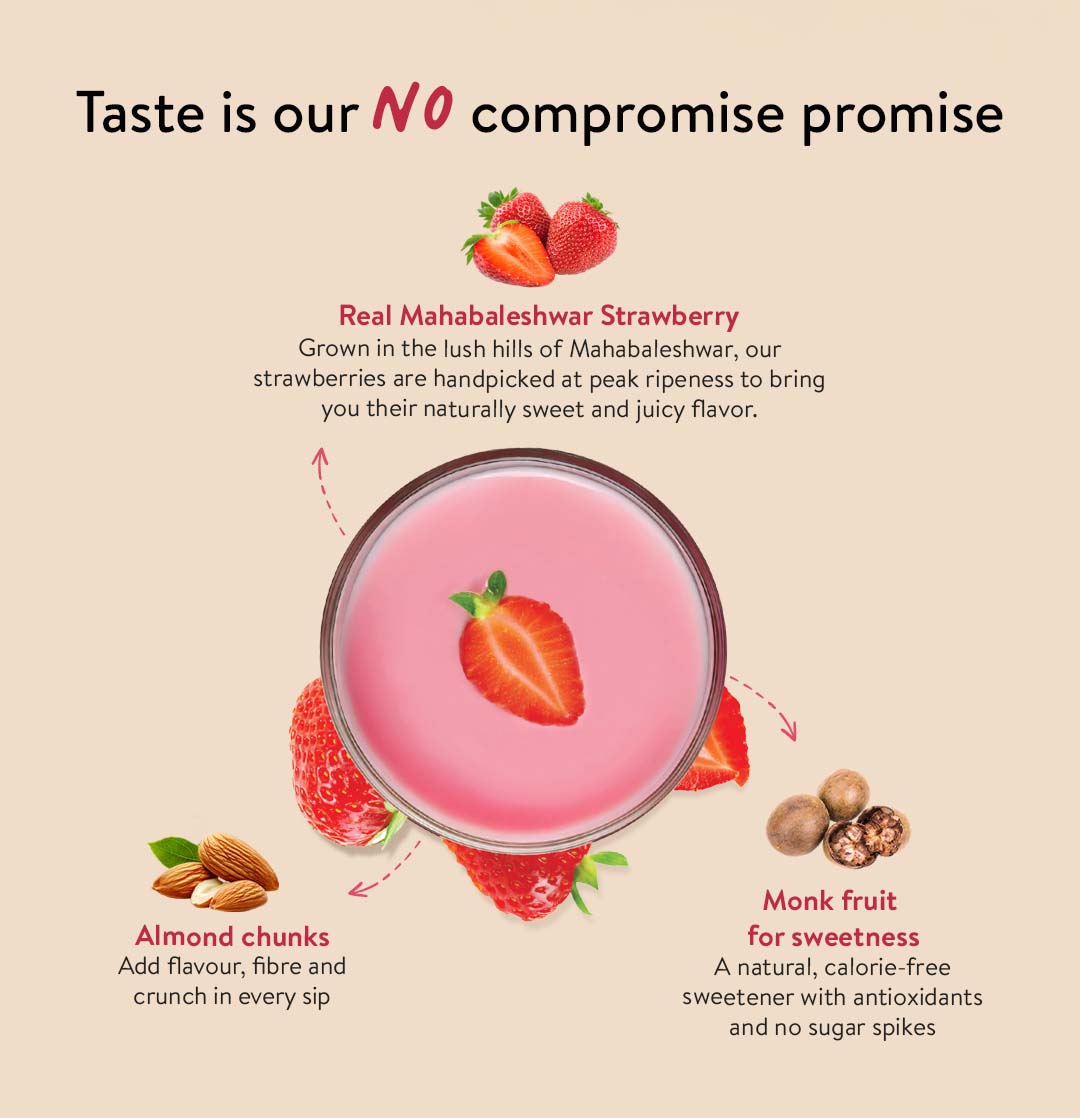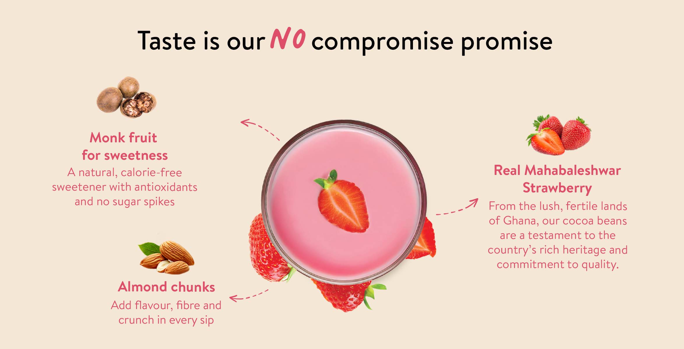 We source real ingredients — like Ghana cocoa, Mahabaleshwar strawberries, Royal Kesar Pista, and Ratnagiri mangoes to deliver shake-like texture and dessert-like taste. No chalkiness. No fake aftertaste.